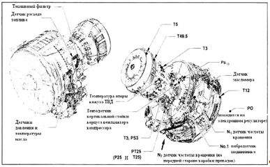 (статическое давление на выходе вентилятора), Р25 (полная температура на входе КВД) и WF (расход топлива). Датчики Т5,