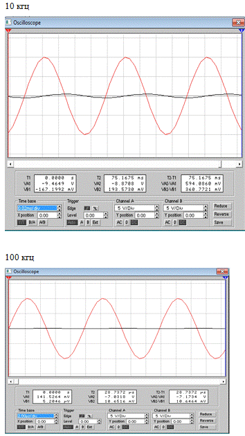 подключен ко входу фильтра, а второй к выходу, наблюдать изменение амплитуды