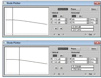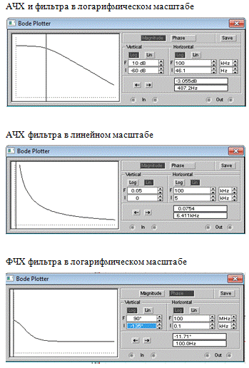 (Bode Plotter) со странички Instruments снимите АЧХ и ФЧХ фильтра в линейном и