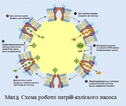насоса. Тому створюється ситуація, коли К+ попадає в клітину більше, ніж вийшло