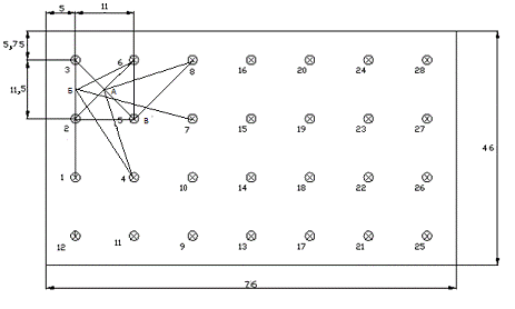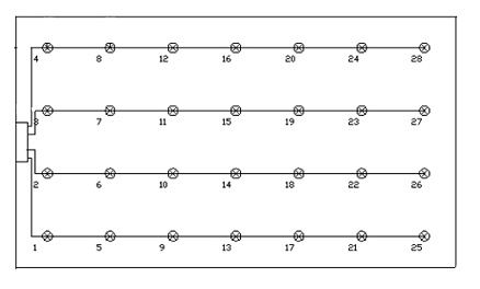 В каждом ряду располагаем 7 светильников, число рядов светильников - 4,