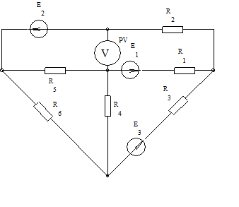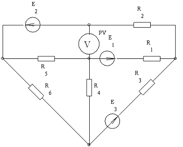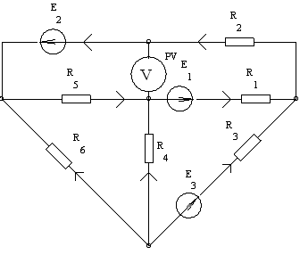 E1=21 В; E2=4 В; E3=10 В; R1=5 Ом; R2=7 Ом; R3=2 Ом; R4=8 Ом; R5=1 Ом; R6=1 Ом.
