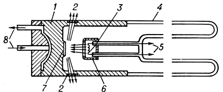 герметически запаянная стеклянная трубка; 2 - катод (тонкий слой меди на трубке