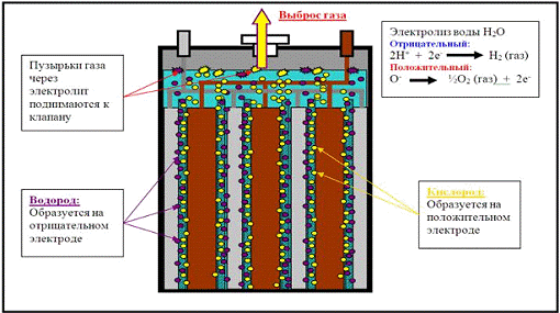 выделением водорода на отрицательном электроде и кислорода - на положительном.