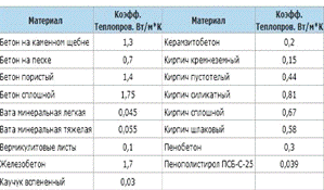 Табл 1. Пример теплопроводимости некоторых строительных