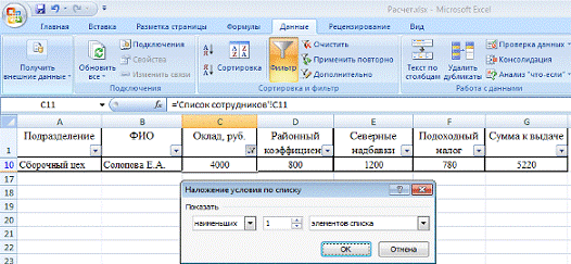 команду Данные - Фильтр.) Определить Ф.И.О. сотрудника, имеющего наименьший
