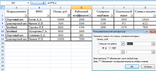 раскрывающегося списка поля Оклад выберем «Первые 10». В окне диалога