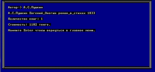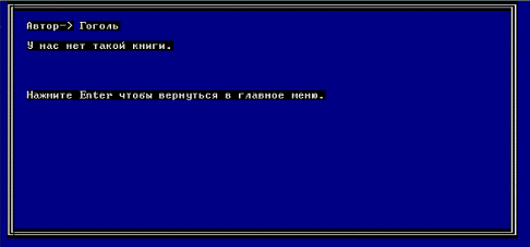 книги.»;}(5,10+i);<< «Нажмите Enter чтобы вернуться в главное меню.»;