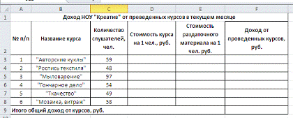 13. Создайте таблицу "Доход НОУ "Креатив"