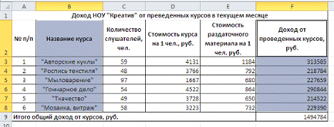 Рисунок 9 - Вид таблицы "Доход НОУ "Креатив"