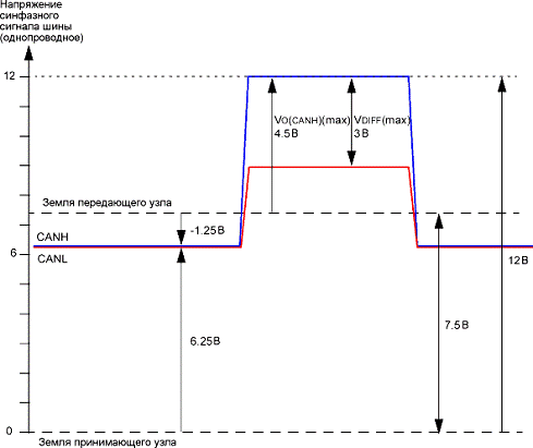 сигнала для рецессивного состояния составляет - 6.25 В для принимающего узла и