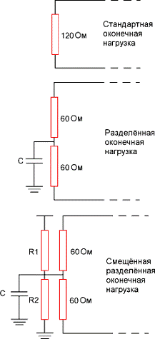 шины составляет 120 Ом. Есть несколько различных способов реализации оконечной