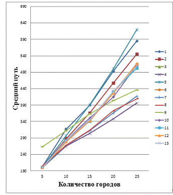 Рисунок 22. Зависимость среднего найденного пути от всех протестированных