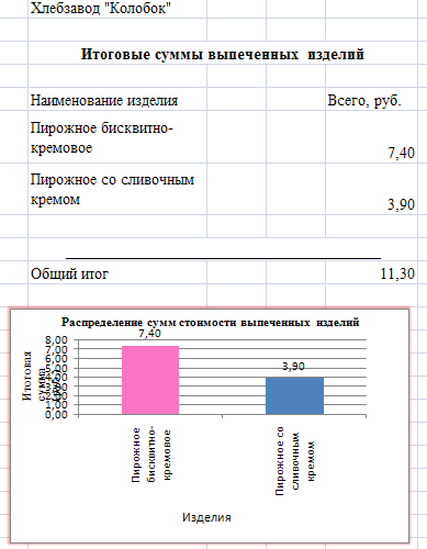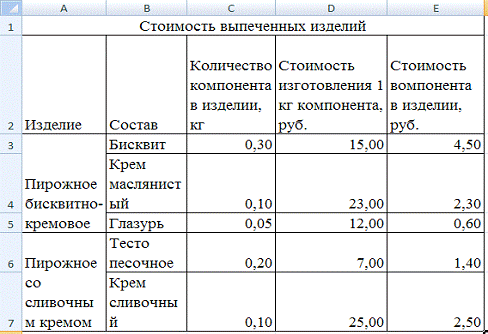 таблицу, в которой будут содержаться стоимость выпеченных изделий