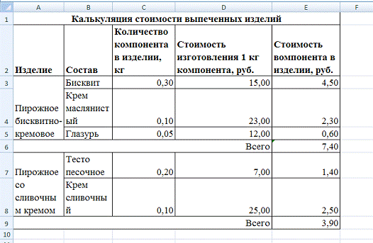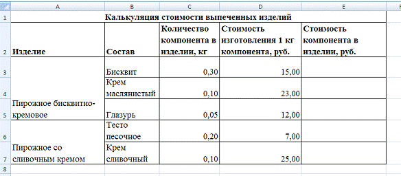 MS Excel создать таблицу, в которой будет содержаться калькуляция стоимости