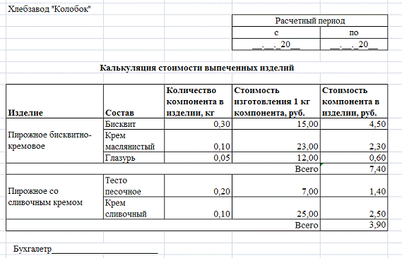 Рис. 5 - Калькуляция стоимости выпеченных