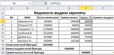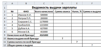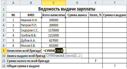 Начислено всей бригаде: поставим курсор в ячейку