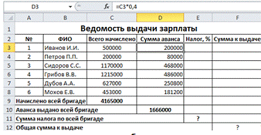 ячейку D3 введем формулу: =C3*0,4 и растиражируем эту формулу для диапазона
