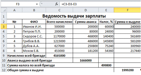 Рассчитаем сумму к выдаче. Для этого в ячейку F3