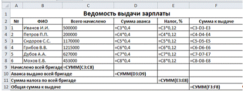 ячеек D3:D8. Для подсчета общей суммы аванса воспользуемся функцией СУММ().