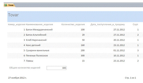 значений всех полей и суммарное количество изделий в примечании отчета.