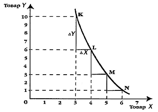 к точке N) количество товара Y, от которого потребитель готов отказаться (ΔY), сокращается, т.е.