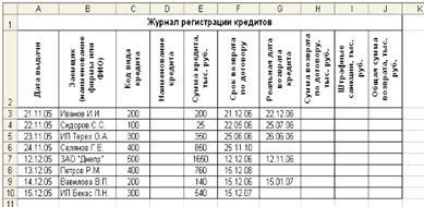 «Журнал регистрации кредитов», находящейся на листе Журнал регистрации кредитов