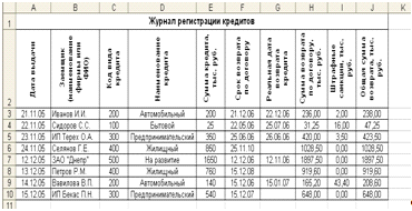 регистрации кредитов», находящейся на листе Журнал регистрации кредитов MS Excel, следующим образом: