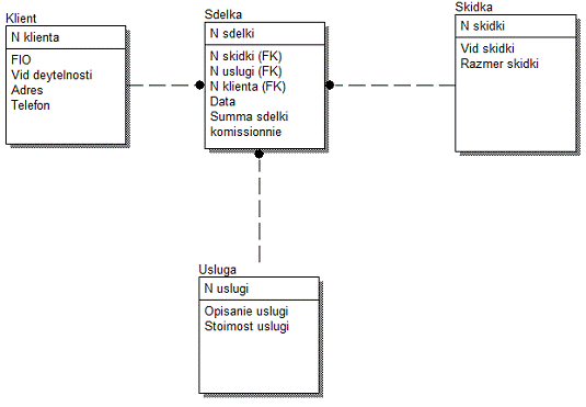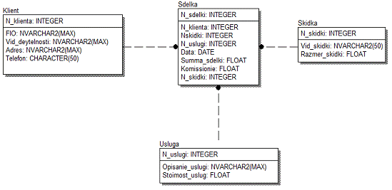 «Клиент», «Скидка», «Услуга» и «Сделка», между которыми установлены