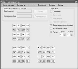 В программе реализованы такие задачи, как: выбор действия над матрицами,