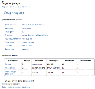 странице также представлено содержание заказа с перечислением товаров, а также
