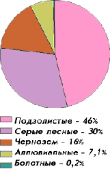 типы почв: черноземы, серые лесные, дерново-подзолистые, частично аллювиальные.