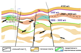 скорости (3000-3700 м/с). И в области между разломом (на 130 пикете) и