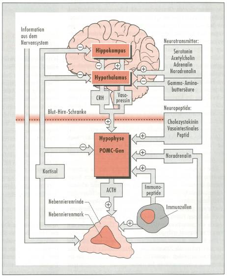 Kortisol, einem Stresshormon. Es hemmt in einer Rückkopplungsschleife die