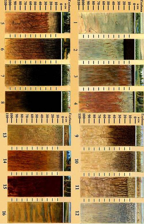 Солонець. 12. Солончак. 13. Сірозем. 14. Жевтозем. 15. Червонозем. 16.