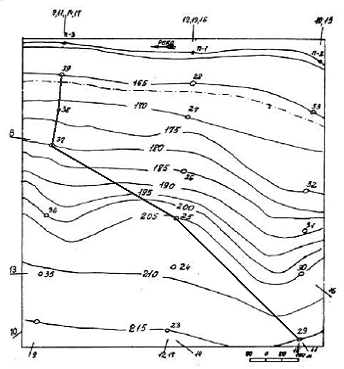 горизонталями, и все абсолютные отметки устьев скважин, находившихся на линии