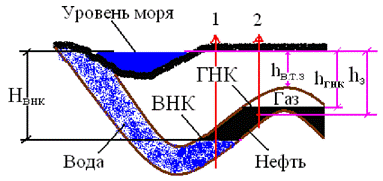 контактов газ-нефть-вода в разных частях залежей, форма и размеры залежей;