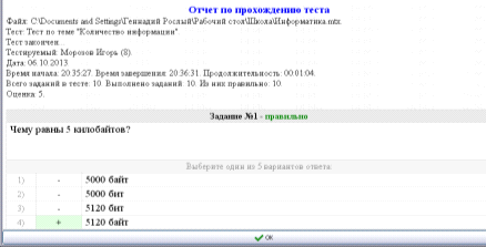 вывода результата тестирования зависит от параметров теста, заданных в
