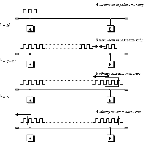 ситуация коллизии усиливается посылкой в сеть станциями, начавшими передачу