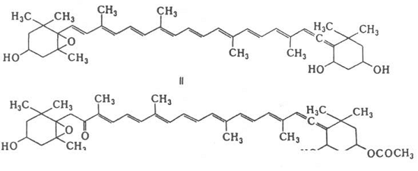 містяться у листях зелених рослин (ксантофіл Берцеліуса), ідентичні