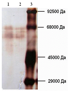 персистирующей стадии; 3 - маркеры: 68кДа-БСА, 45кДа - ЯА, 29кДа -