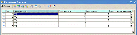 справочник «Проекты» содержащий исходные данные инвестиционных проектов.