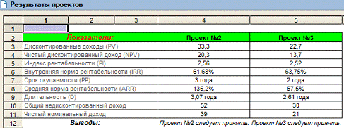 результаты вычисления и анализа конкретного инвестиционного проекта;