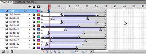 На шкале времени Timeline выберите кадр 5 в слое Fizz,