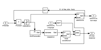 Если кассир не занят (вход1 «занятость кассира» равен 0) и в очереди кто-нибудь