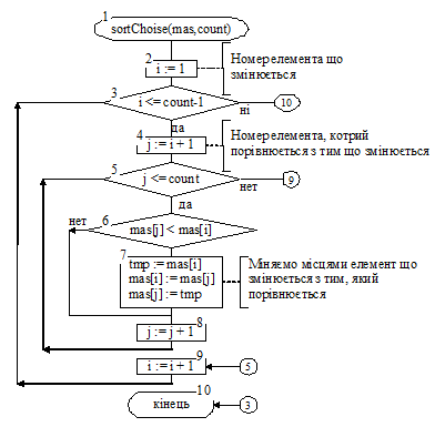 порівнювані елементи міняються місцями. Схема алгоритму сортування масиву
