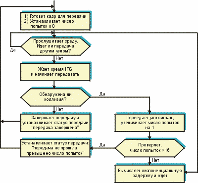 задерживается из-за временных задержек в случае коллизий. Средняя задержка