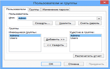 окне пользователи и группы были добавлены группы медсестра, врач, приемный