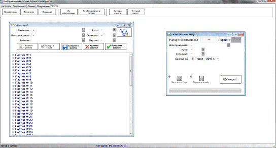 оборудования, суточные сводка и рапорт по дате, скважинам, буровым партиям и