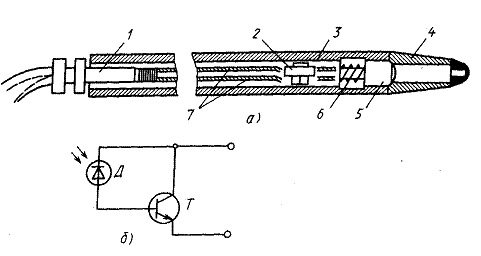 транзистор, 3 - корпус, 4 - наконечник,5 - фотодиод, 6 - пружинный контакт, 7 -
